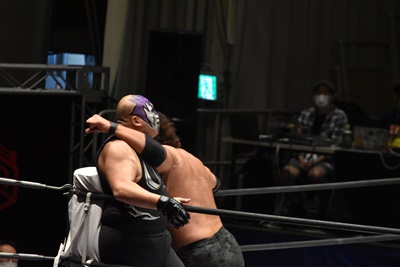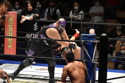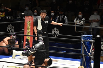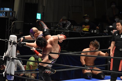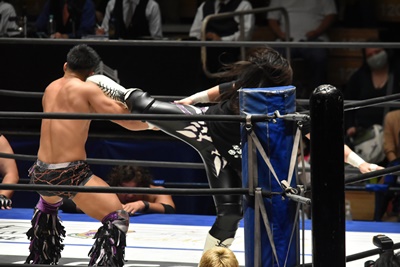 高尾ジャンピングハイキックからダイビングフットスタンプ(右写真)、カウント2。高尾コーナーの佐々木に突っ込む、佐々木カウンターのスピアー、ポーリーにタッチ。