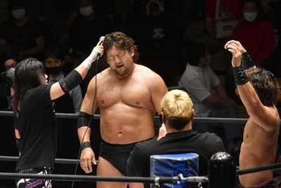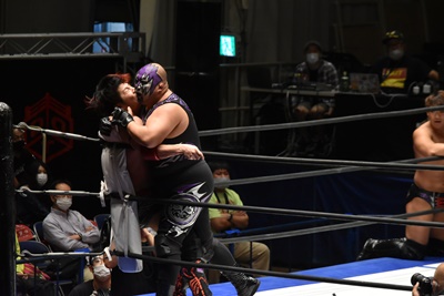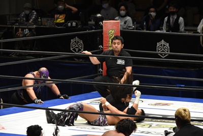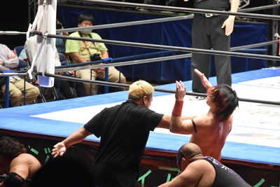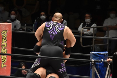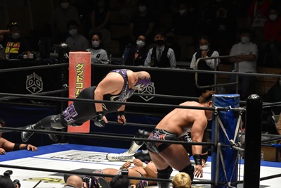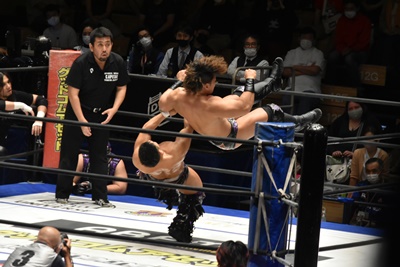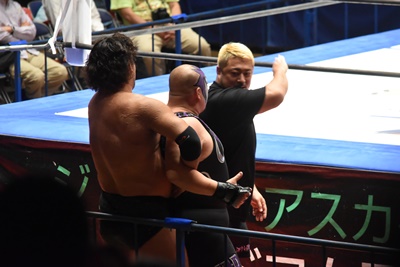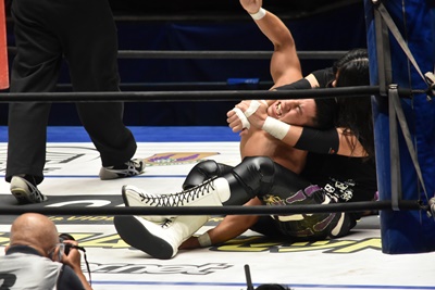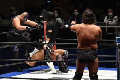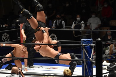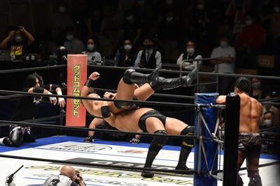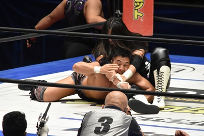 佐々木がペディグリーの体勢、石川リバース(左写真)。ポーリーと高尾にタッチ。
