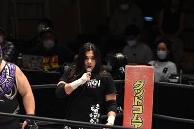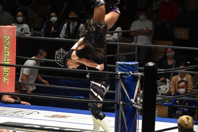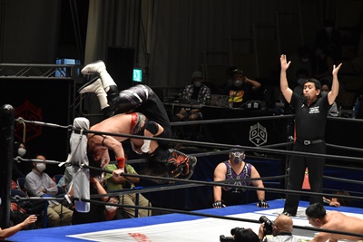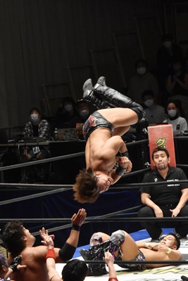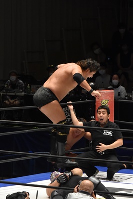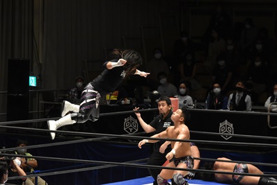 佐々木がダイビングエルボードロップ(右写真)、カバーは石川と高尾がカット。