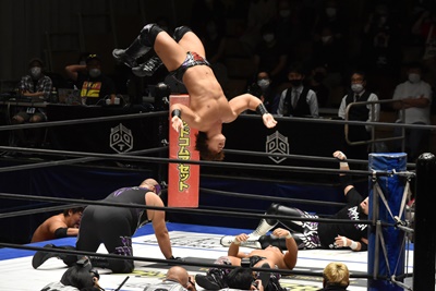 遠藤がポーリーの背中を踏み台にして島谷にムーンサルトプレス(右写真)、