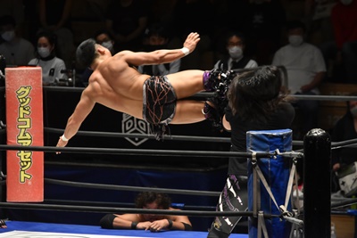 島谷ドロップキック(左写真)、佐々木もドロップキック。