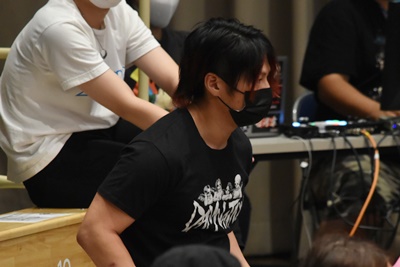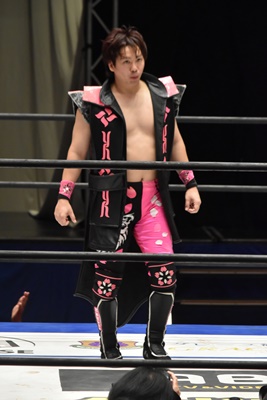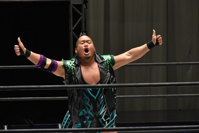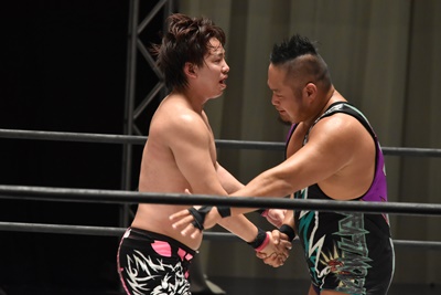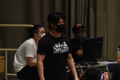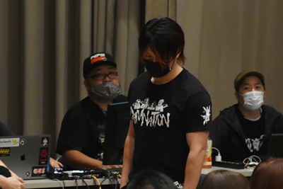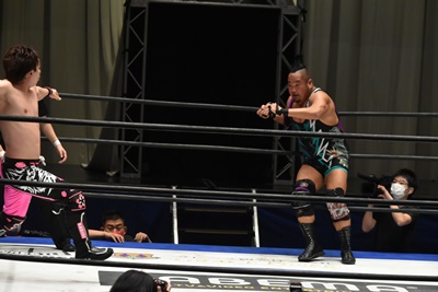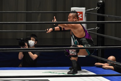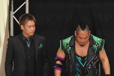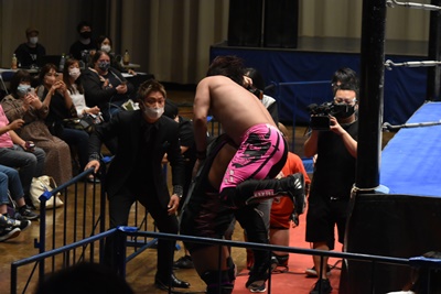 両選手の入場の前にチーム・ドリフの盟友だった高尾蒼馬がふらっと姿を現し(右写真)、