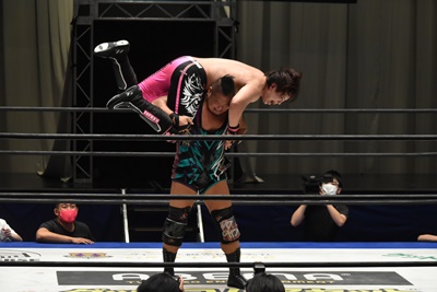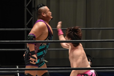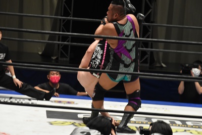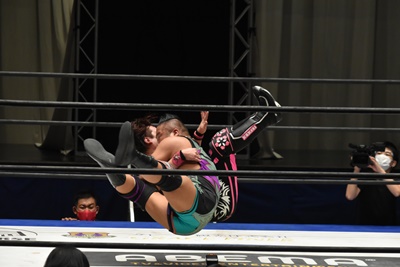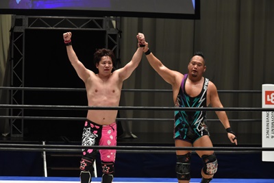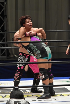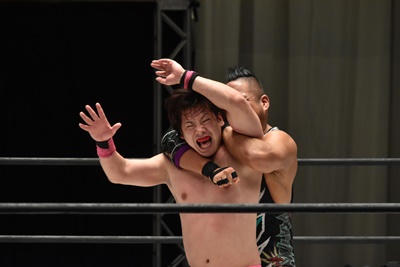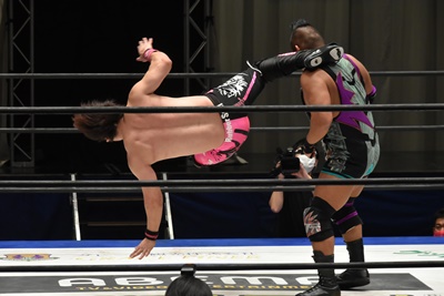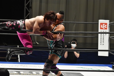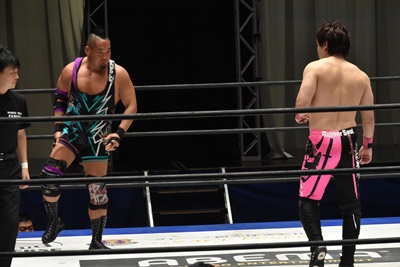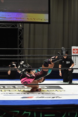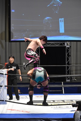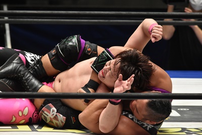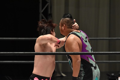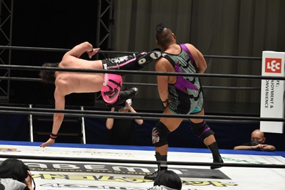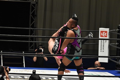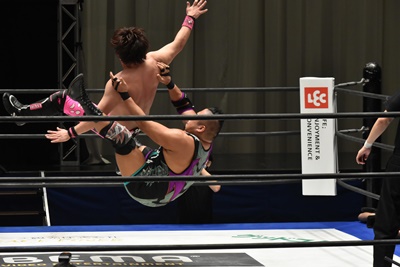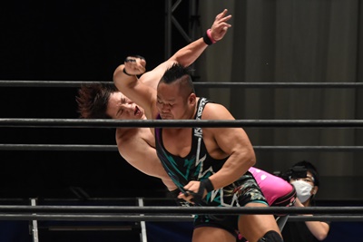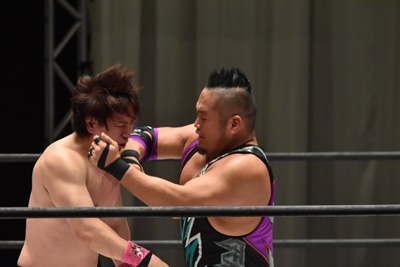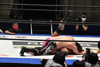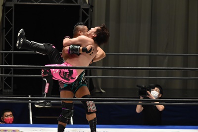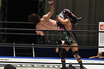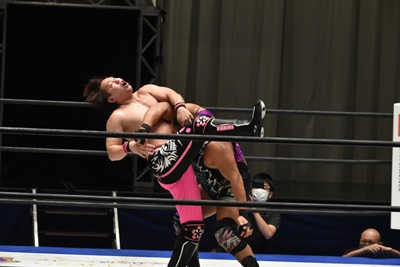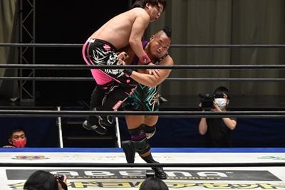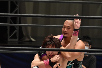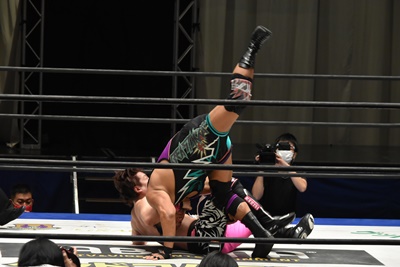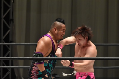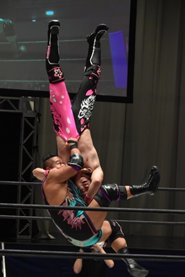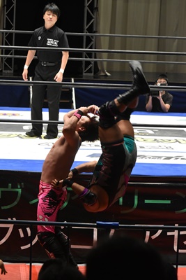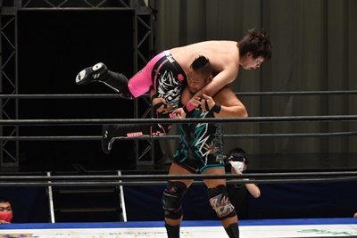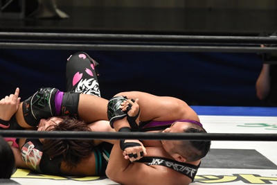 石井タイガースープレックス狙う、入江切り返してスクールボーイ(左写真)、カウント2.