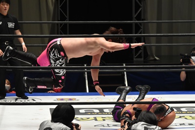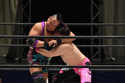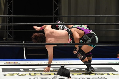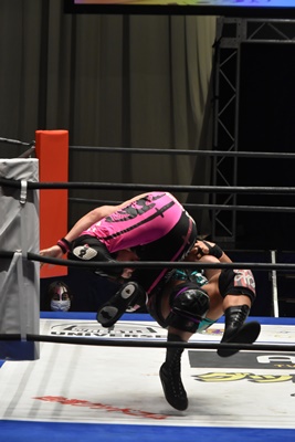リングに背を向けた状態の石井に入江はスーサイドダイブの要領で体をぶつけていく(左写真)。