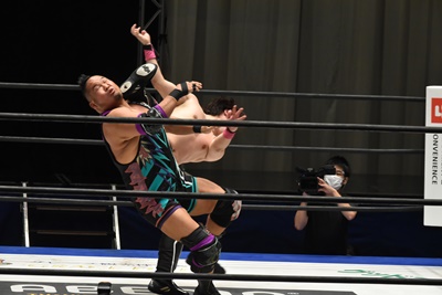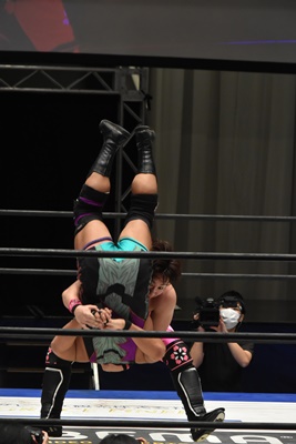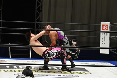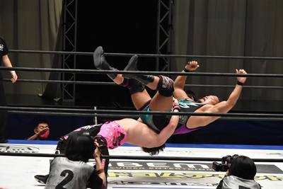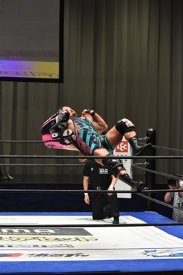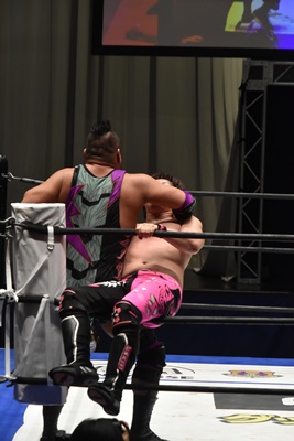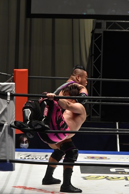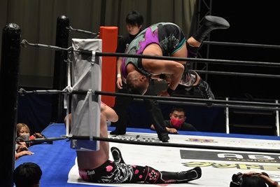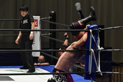 ロープ際に下がった入江に石井突っ込む、入江かわして石井をエプロンに(右写真)。