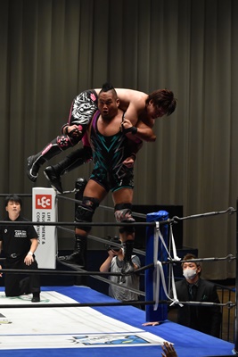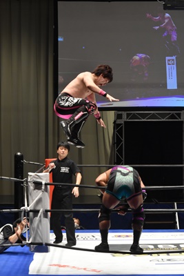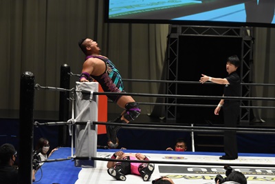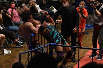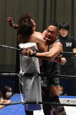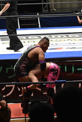 石井を吹っ飛ばす(右写真)、石井は場外エスケープ。