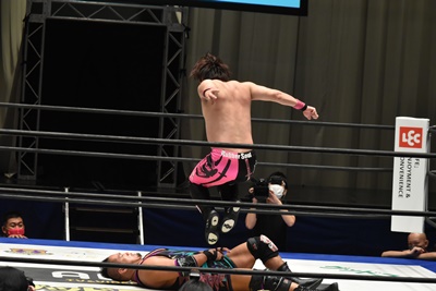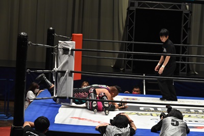石井バック取る、入江コーナーまで逃げると石井の両足をセカンドロープに引っ掛けて(右写真)