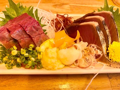 事前に調べて宇都宮は時短してないことはわかってたが、どの餃子屋も居酒屋も満員御礼うぇーい状態。あっさり恐れをなし「お一人様歓迎」と出てる天ぷら・刺身自慢の居酒屋「だるまや」に入る。かつおの刺身とたたきの合い盛り。
