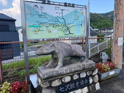 本厚木駅からちょっと離れた神奈川中央交通バス厚木バスセンターに行き、14時発の七沢行バスに乗車、30分で七沢温泉入口バス停に到着。イノシシが名物なのかな?バス停の近くにあった「黄金井酒店」でクラフトビール2本買う。