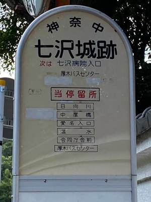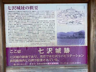楽天トラベルに表示されていた地図がわかりづらかったので「こっちかなー」くらいな感じで歩くと途中に「七沢城址の概要」という表示板が。そんな城があったのか。鎌倉時代の城らしいけど。ネットで調べても遺構はないらしい。