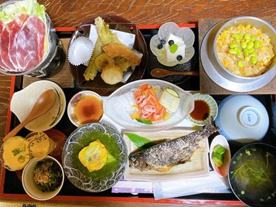 夕食。刺身はべにます、焼き魚はニジマス。ほか翡翠茄子のモロヘイヤ生姜餡、つるむらさき・きくらげ・菊花のおひたし、オクラとコリンキーのスープ、糸瓜土佐酢和え、長芋・いちじく・オクラ・福耳唐辛子・かぼちゃの天ぷら、猪鍋、とうもろこしと枝豆の炊き込みご飯、お吸い物。デザートがココナツプリンとブルーベリー。