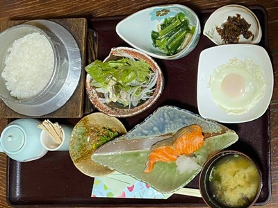 6時に起き、7時から風呂。8時から朝食。目玉焼き、鮭(?)塩焼き、納豆、サラダ、小松菜の油揚げの煮びたし、じゃこ(?)の煮たの、味噌汁。なかなかのヴォリュームだがご飯美味しかったので完食。