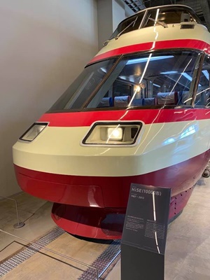 歴代ロマンスカーが並ぶ。右からLSE(2018年まで走ってた)、NSE(1999年まで走ってた)、SE(1992年まで走ってた初代型だがさすがに見た記憶はない)。「車庫に置いてたんじゃもったいない」ということでこの博物館作ったんだろうなあ。