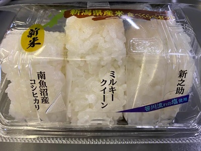 駅弁はやめといたが「新潟県産米の食べくらべ」というおにぎり3個入りを購入。食べくらべても味の違いはよくわからんが、新之助が普通にコンビニおにぎりに使われてる感じで、ミルキークイーンはちょっと柔らかい気がしたけどそれは炊き方の問題のような。コシヒカリは美味かったが、コシヒカリだと知らなくて食べても一番美味いと思うかはわからない。
