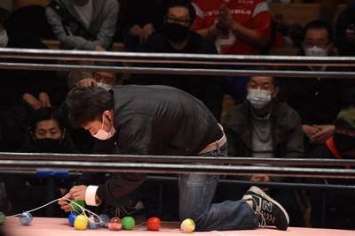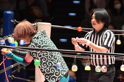2人の手首を紅白ロープで結んでようやく試合開始。2人ロックアップすることもなくカプセルを開け始める。木曽レフェリーの「ハズレです!」の声が何度も響く(右写真)。