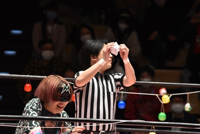 中島がハイパミのクロスボディかわしネックブリーカー連発。カプセル開けて(右写真)木曽レフェリーに渡す、