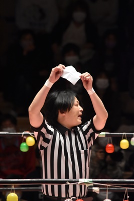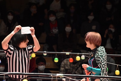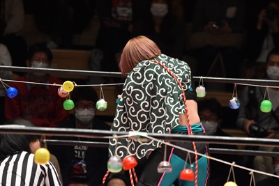 「フォール、ギブアップによる決着なし、2回当たりを引いた選手の勝ち」という前代未聞のルールに客席から「なんじゃそりゃ!」と声が上がる。うん、Twitterで発表されたルール見て「なんじゃそりゃ?」と思いましたもん。「なんじゃ」と言われてもプロレスですけど。