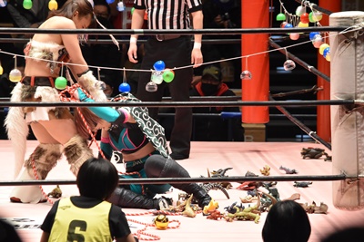雪崩式フランケンシュタイナー狙うがハイパミ突き落とす(右写真)。自分が持ち込んだソフビの海に落下。