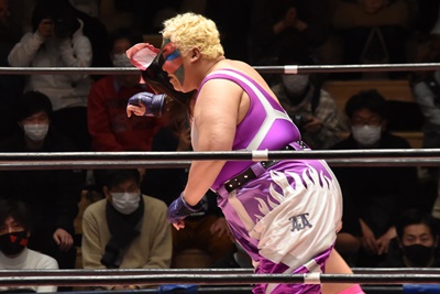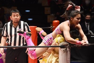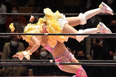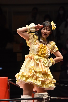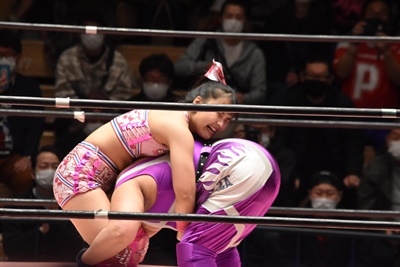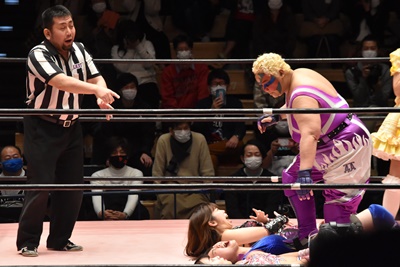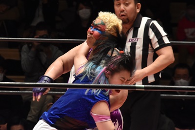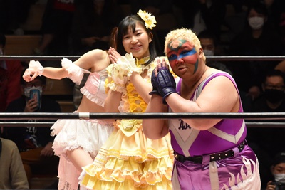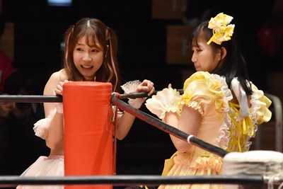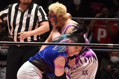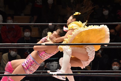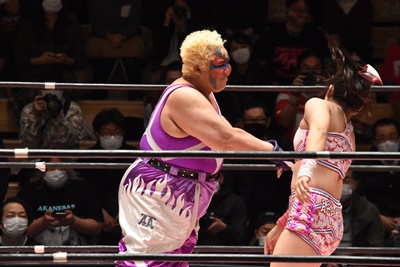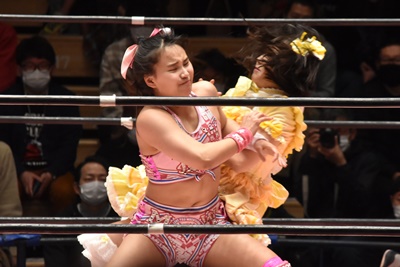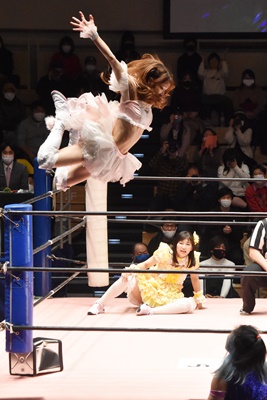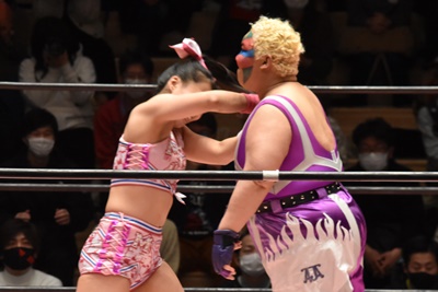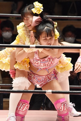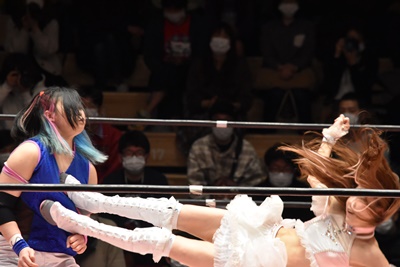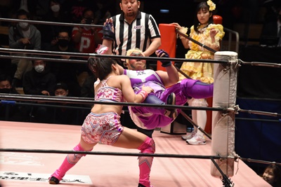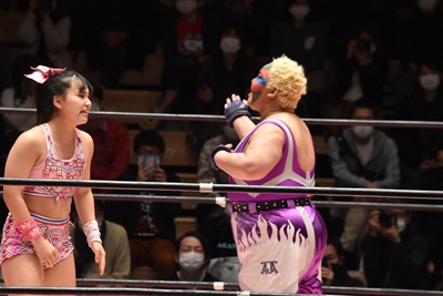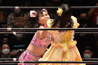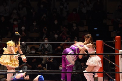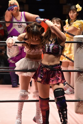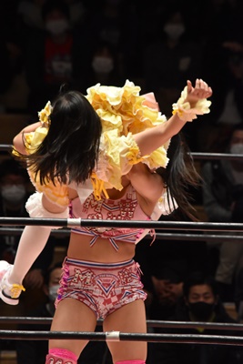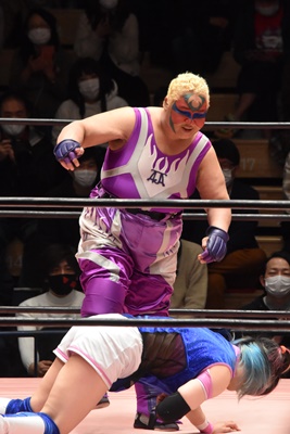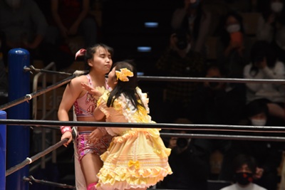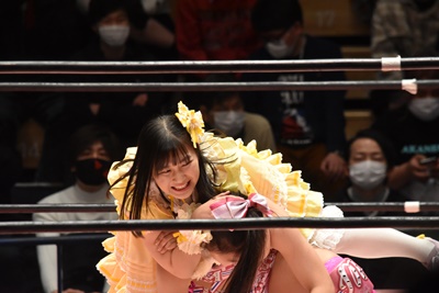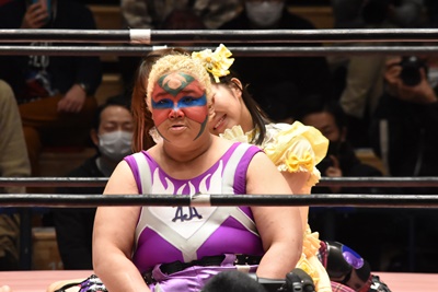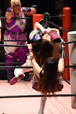 角田DDT、カウント2。紫電改狙って(?)ファイアマンキャリーに担ぐがみずぴょん着地、カサドーラで丸め込んでボディにフットスタンプ(左写真)。みずぴょんアジャにタッチ、角田も未詩にタッチ。