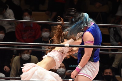 みずぴょんエルボー連打(右写真)、ロープに振る、魅星切り返してドロップキック、角田にタッチ。
