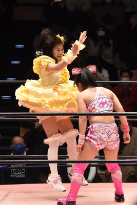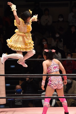 魅星ロープに飛ぶ、みずぴょんカウンターのドロップキック(左写真)、らくにタッチ。