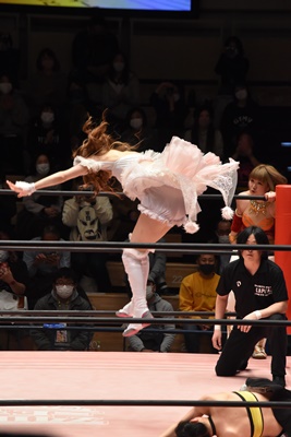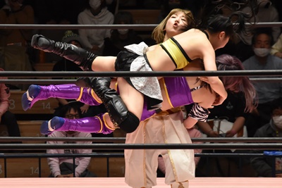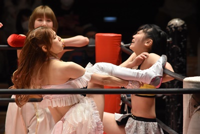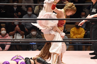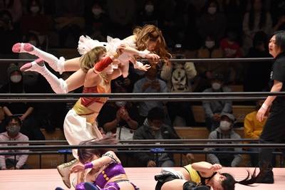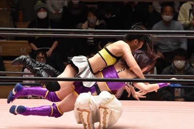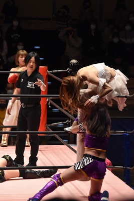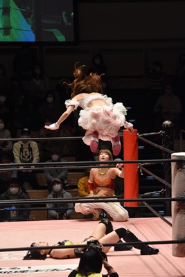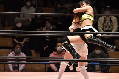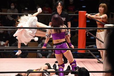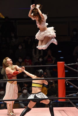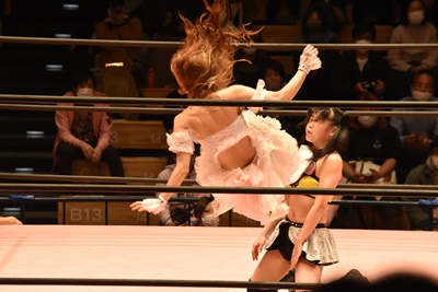 鈴芽のトゥインクルから遠藤と鈴芽ダブルのドロップキック(右写真)。