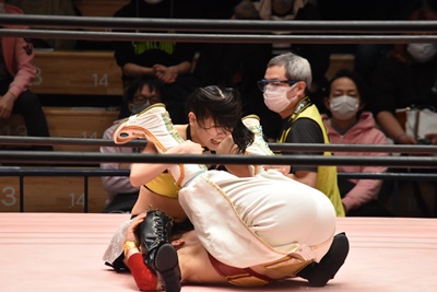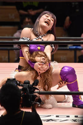ロープに振る、ユカッチ切り返すが鈴芽はバックエルボー、カウント2。鈴芽スリーパー(右写真)、