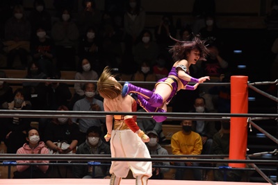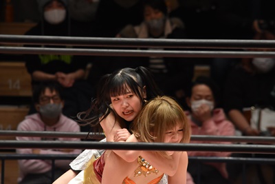 ロックアップ、ブレーク。手四つからみずぴょんガットショット、ロープワーク、鈴芽エルボー、みずぴょんかわしてコーナーに振り突っ込む、鈴芽ジャンプしてかわし(左写真)バックエルボー。