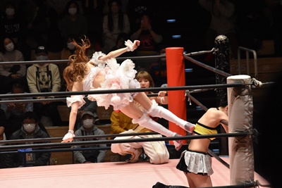 足のすくい合い、みずぴょんブリッジで立ち上がるとドロップキック(右写真)、自軍コーナーに連れ帰り腕にかみついてユカッチにタッチ。