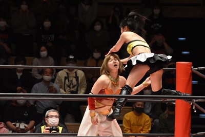 鈴芽再度コーナーに上ってダイビングボディアタック(左写真)、カウント2。