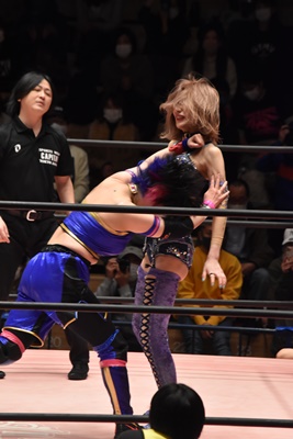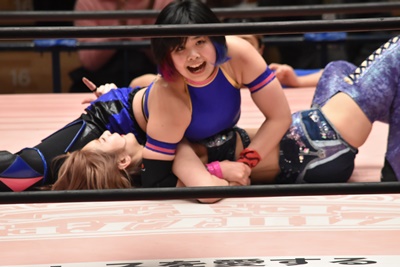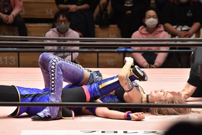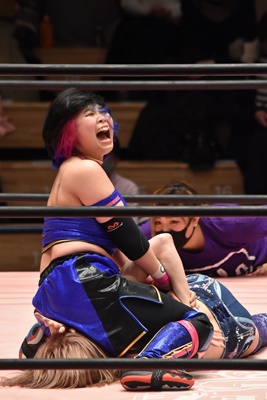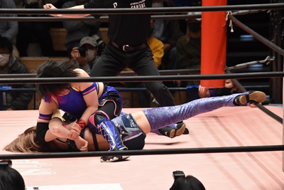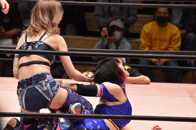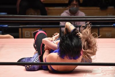腕を絞り上げる(右写真)。髪をつかんでレフェリーがブレーク命じる。かみーゆトーホールド、リリースしてストンピング。