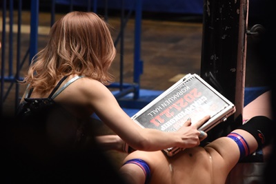 かみーゆ先にリングに戻る、魅星がカウント18でリングに戻るとノドをトップロープにぶつけカバー、カウント2。両足をたたんで(左写真)、