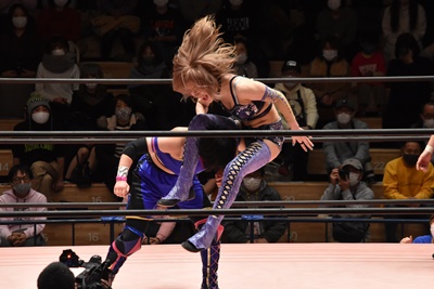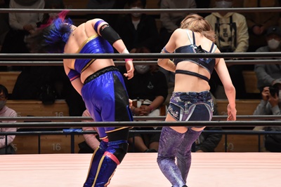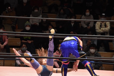 魅星かみーゆをコーナーに振って串刺しエルボーからミラマーレに行くがかみーゆは長い足でエスケープ(右写真)。