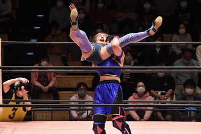 かみーゆフェーマサー、魅星かわしてバックドロップ(右写真)、カウント2。