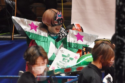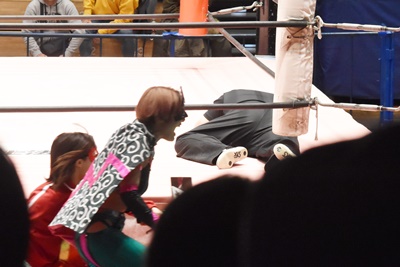 ウルショコ逃げようとする、ユキ振り回す、マントが取れ(左写真)、ユキは松井レフェリーに激突。