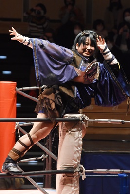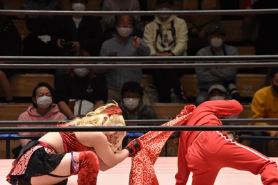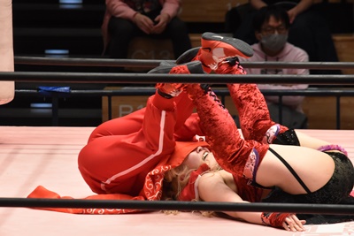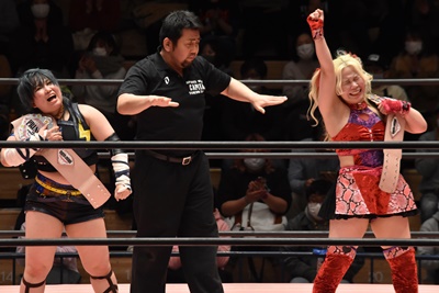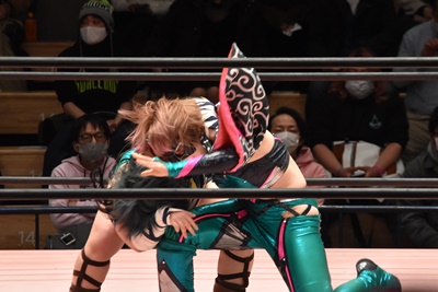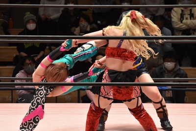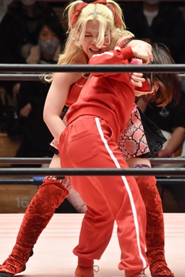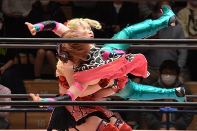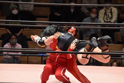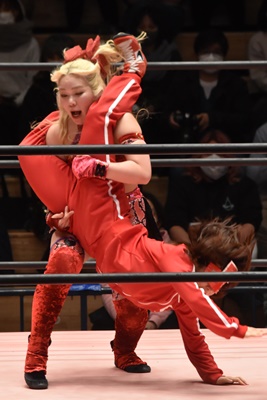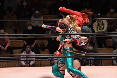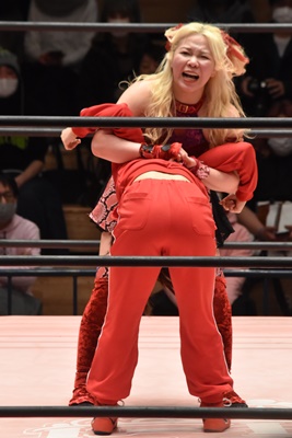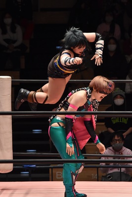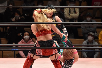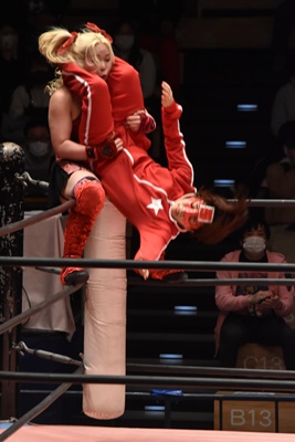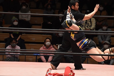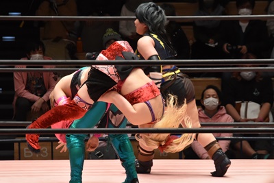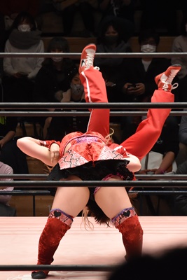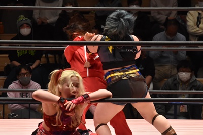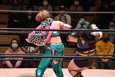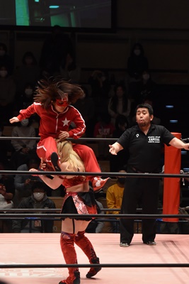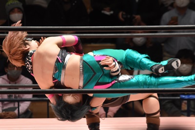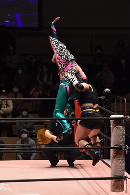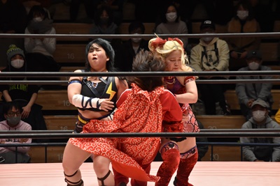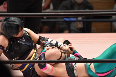 ショヲコがユキをコーナーに上げて雪崩式フランケンシュタイナー(左写真)、カウント2。