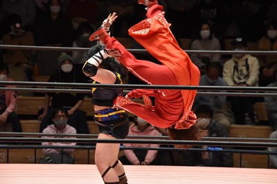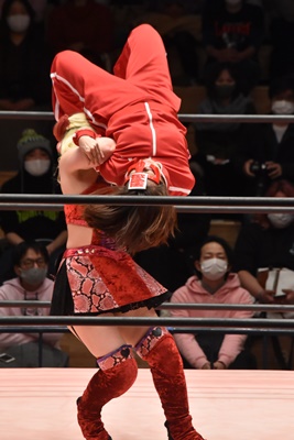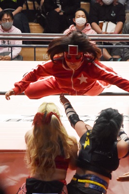 ユキがショヲコを肩車、のどかがコーナーに上って爆れつブルドッグ狙うがショヲコは肩の上で反転(左写真)、ウラカンホイップに切り返す。
