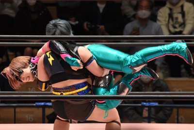 ショヲコ投げっぱなしのノーザンライトスープレックス(左写真)、ユキすぐにヴィーナスDDTで返す。