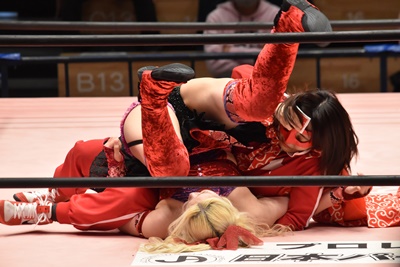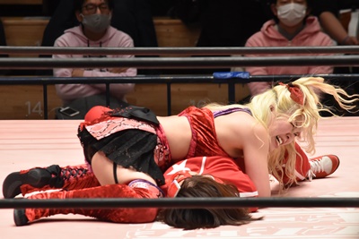 ショヲコがダブルアームの体勢、ユキが逆にリバーススープレックスで投げ(右写真)ホールド、カウントは2。