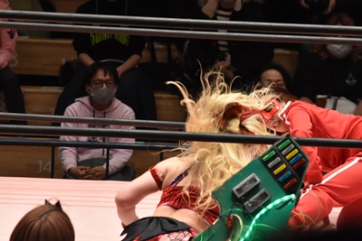 ユキリングにショヲコを戻しカバー、カウント2。ロープに飛んだユキにミサヲが享楽共鳴号の破片で一撃(右写真)。
