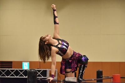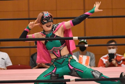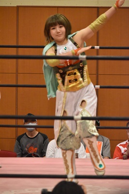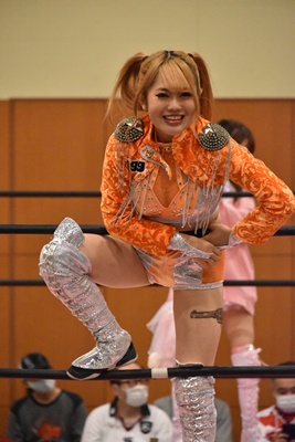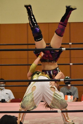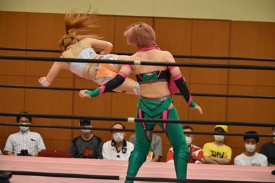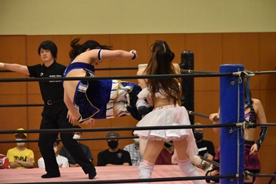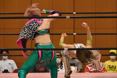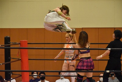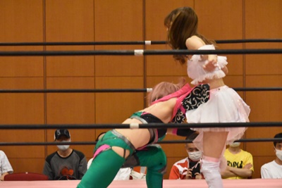 真弥みずぴょんをコーナーに振って串刺しドロップキック(右写真)、なおちぃにタッチ。