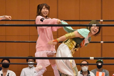 ユカッチがなおちぃにスライディングラリアット(左写真)、