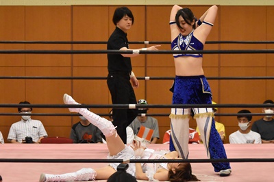 マリカドロップキック、フロントネックロックに(右写真)、なおちぃがカット。