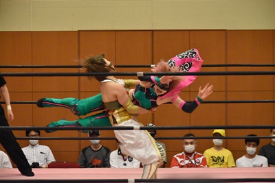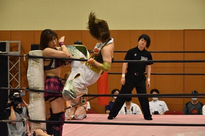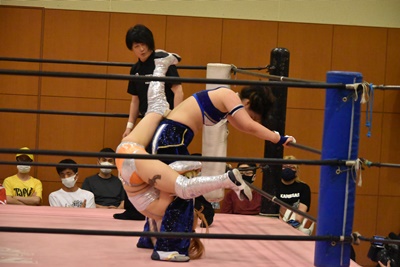 ロープに固定して顔面キック、ロープに振るがみずぴょんはロープに飛び乗って反転式クロスボディ(右写真)、
