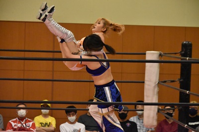 真弥スパインバスター狙うがマリカはブロック(左写真)。10分経過。