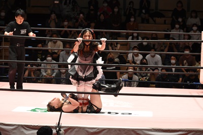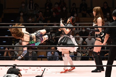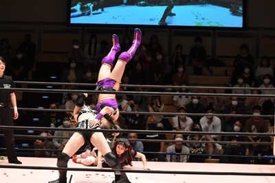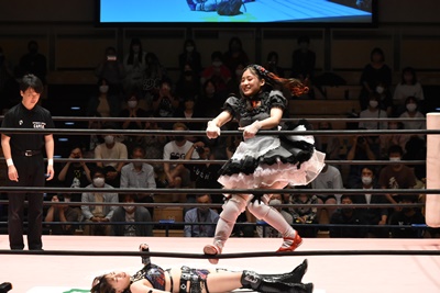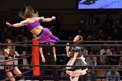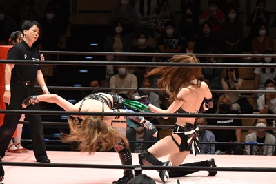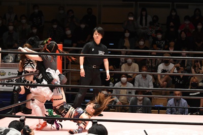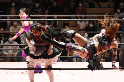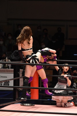 ロープに飛ぶと有栖がカウンターのドロップキック(左写真)、ヒカリにタッチ。