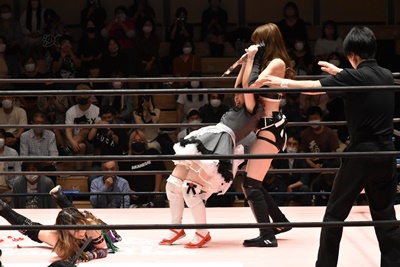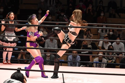 沙希様入ってヒカリをビッグブーツで場外に落とし、有栖にはサッカーボールキック(右写真)。