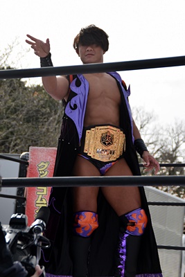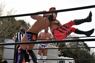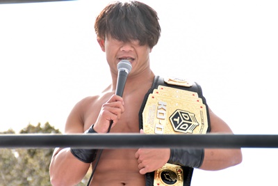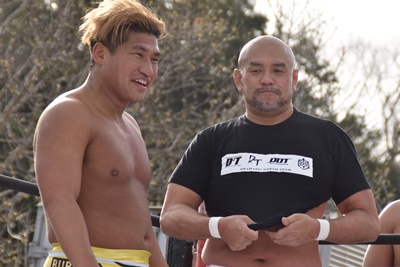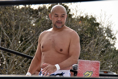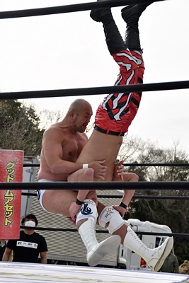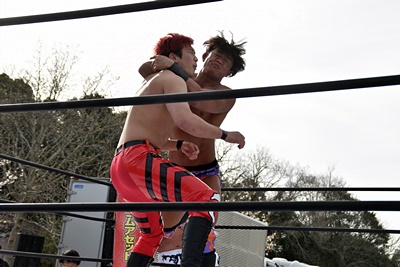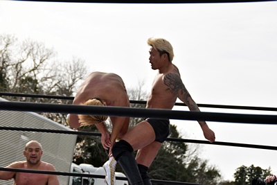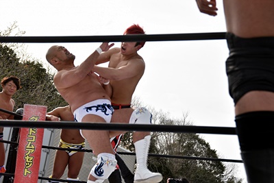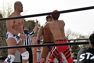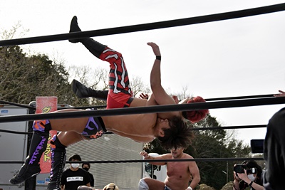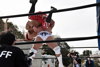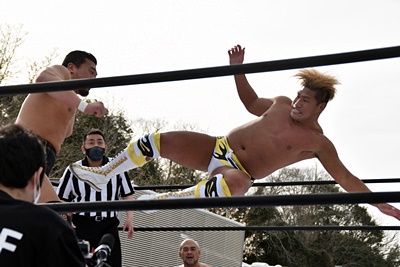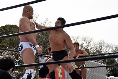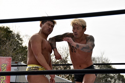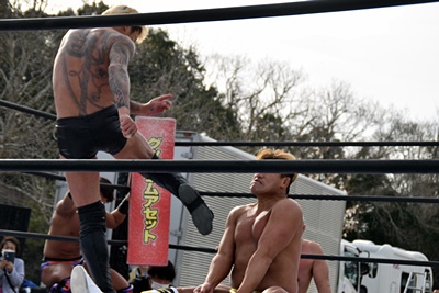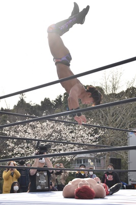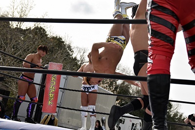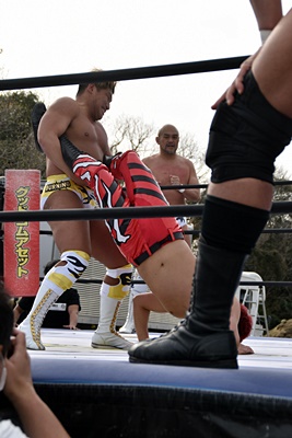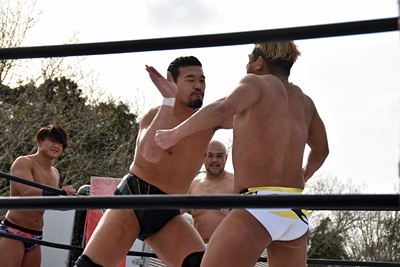 岡谷を突き刺す(左写真)。カウントは2。秋山コーナーに振る、岡谷カウンターのキックからコーナーに上ってミサイルキック、樋口にタッチ。