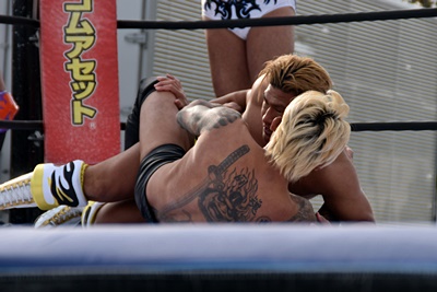 先発は岡田と坂口。岡田タックル行くが坂口切ってバック取ると片羽絞めの体勢に入る(左写真)、