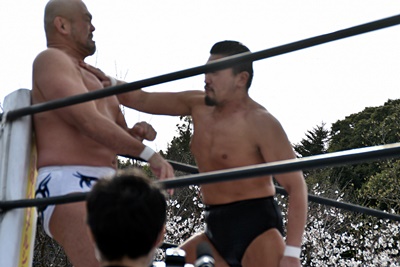 ロックアップ、樋口がロープに押し込むと秋山「養老渓谷だろ!」とブレークを主張(左写真)。「老人をいたわれ」って意味か?樋口ブレーク。